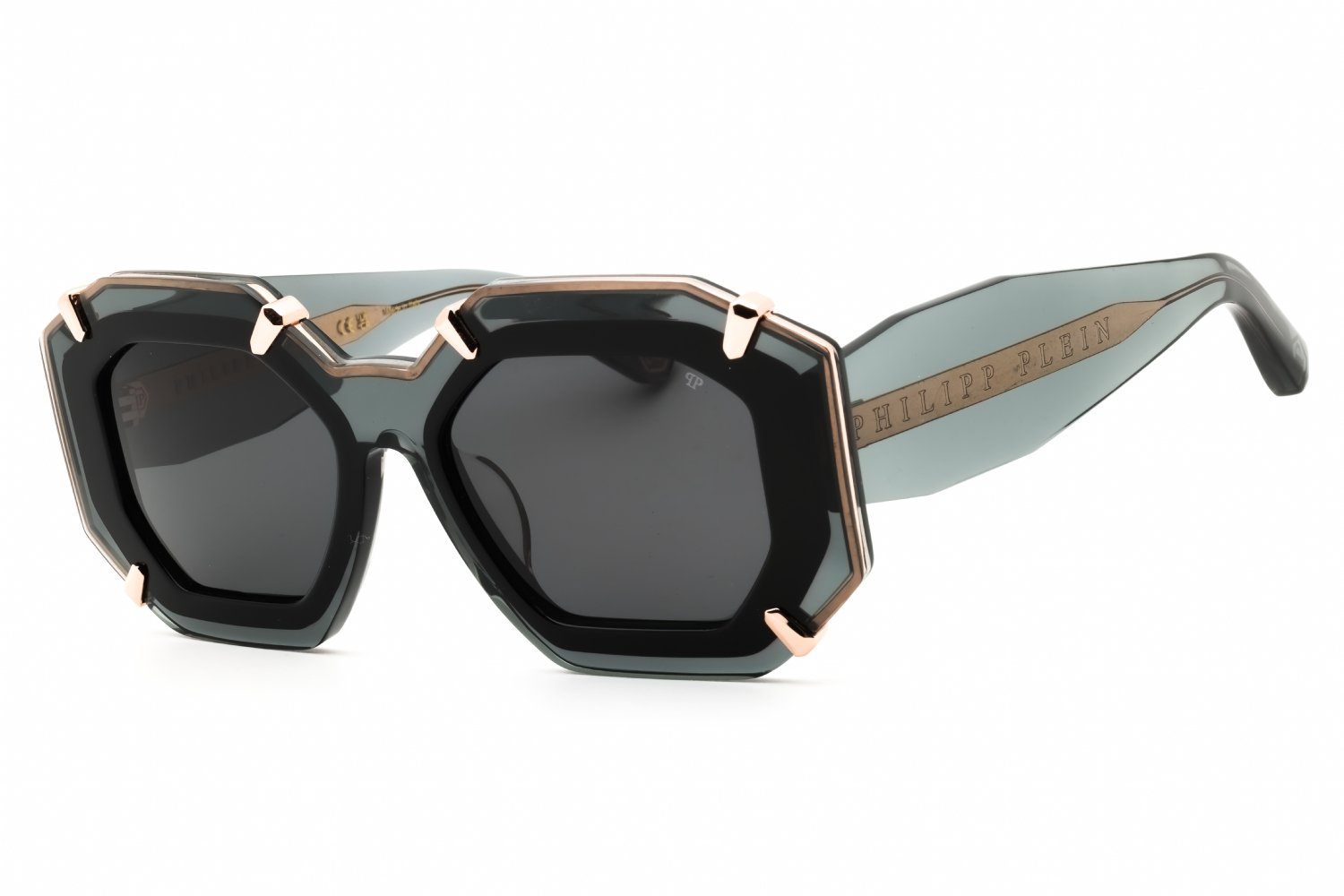 Philipp Plein SPP098V in Shiny Transparent Grey. This model features an eye catching shape to complement your facial features.The frame is made from quality materials, balancing weight and strength for your ultimate comfort.