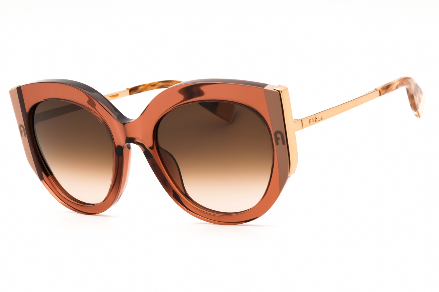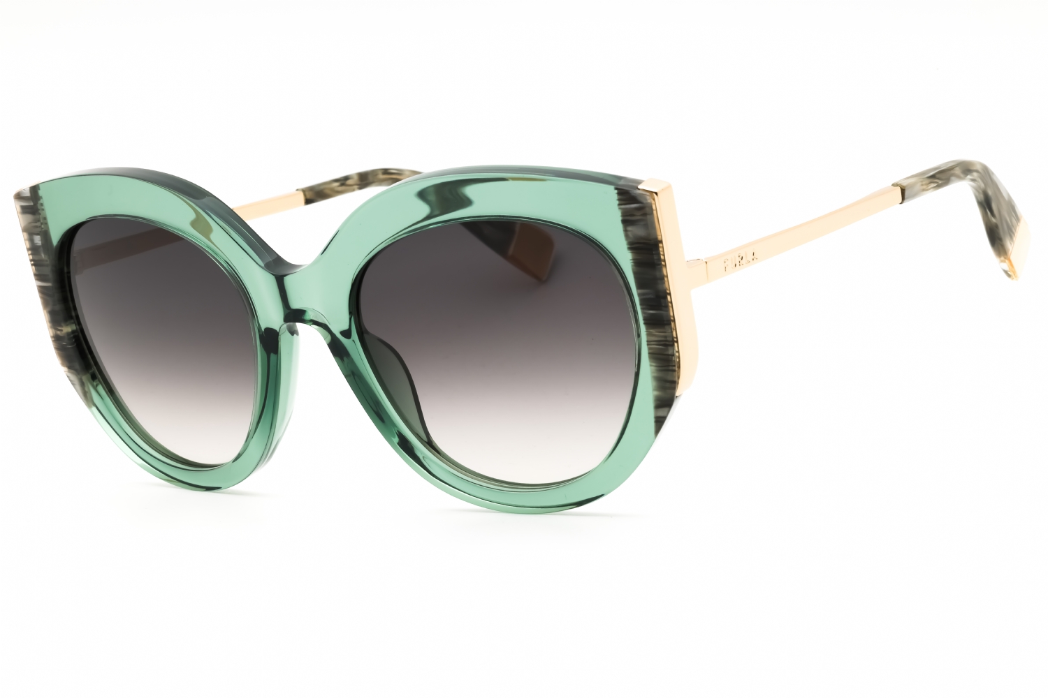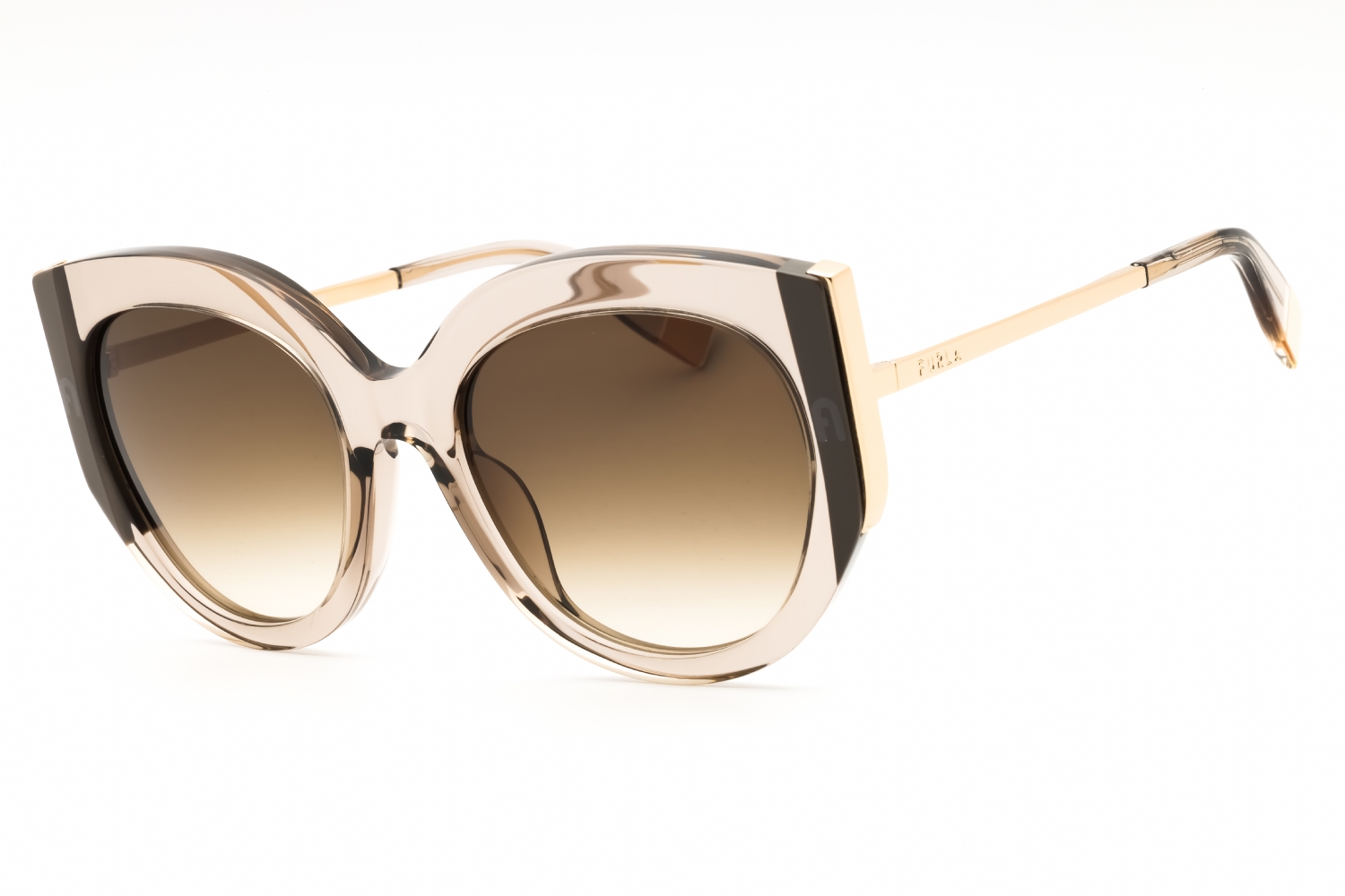 Furla SFU820 in Transparent Beige Brown Grey Laminate. This model features an eye catching shape to complement your facial features.The frame is made from quality materials, balancing weight and strength for your ultimate comfort.