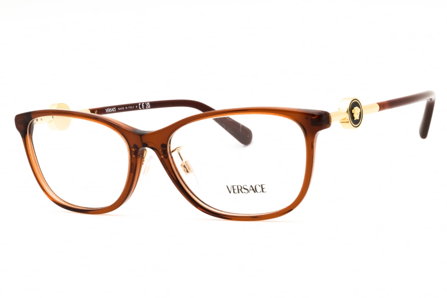 Versace VE3297D in Transparent Brown. This model features an eye catching shape to complement your facial features.The frame is made from quality materials, balancing weight and strength for your ultimate comfort.